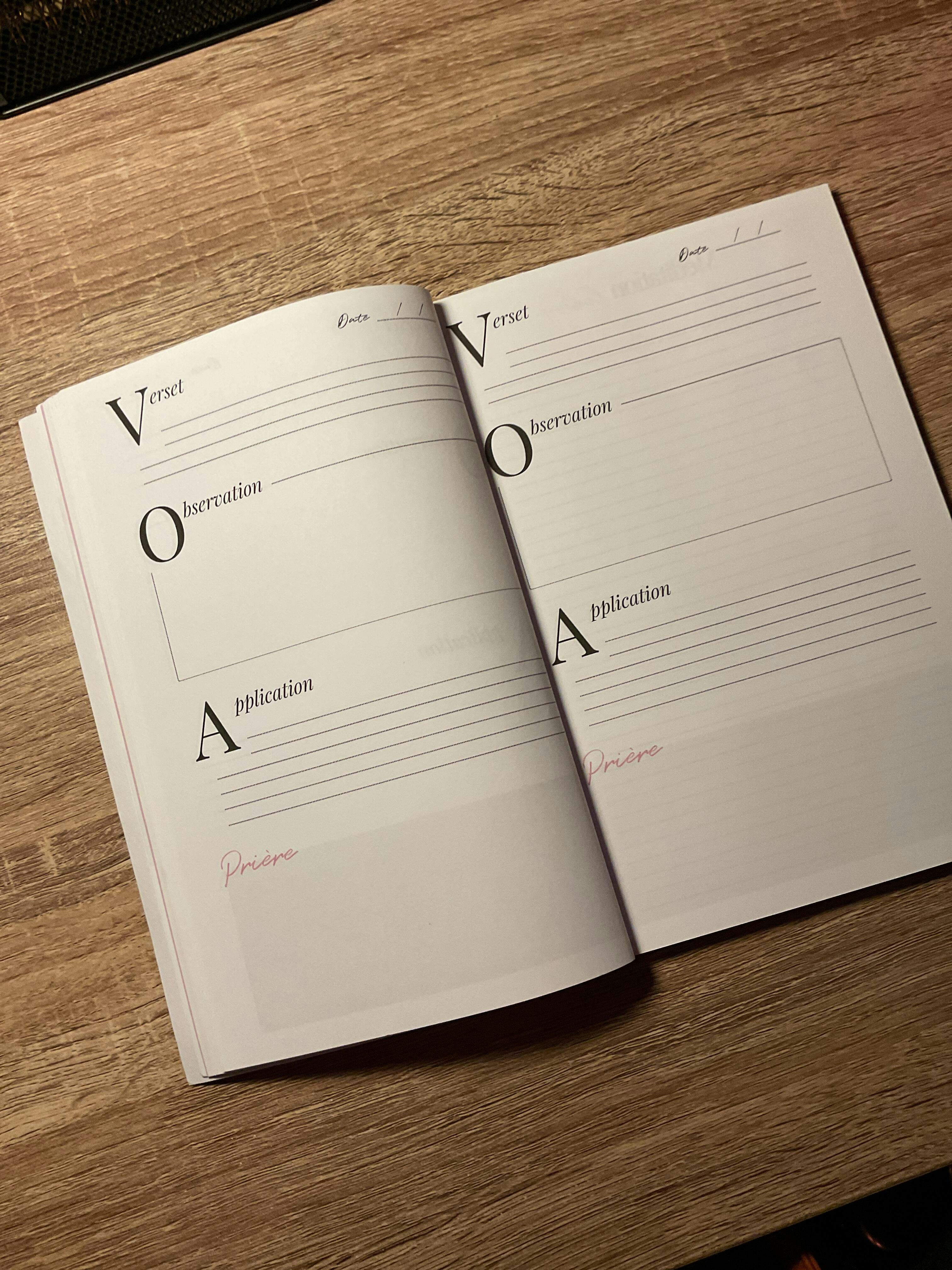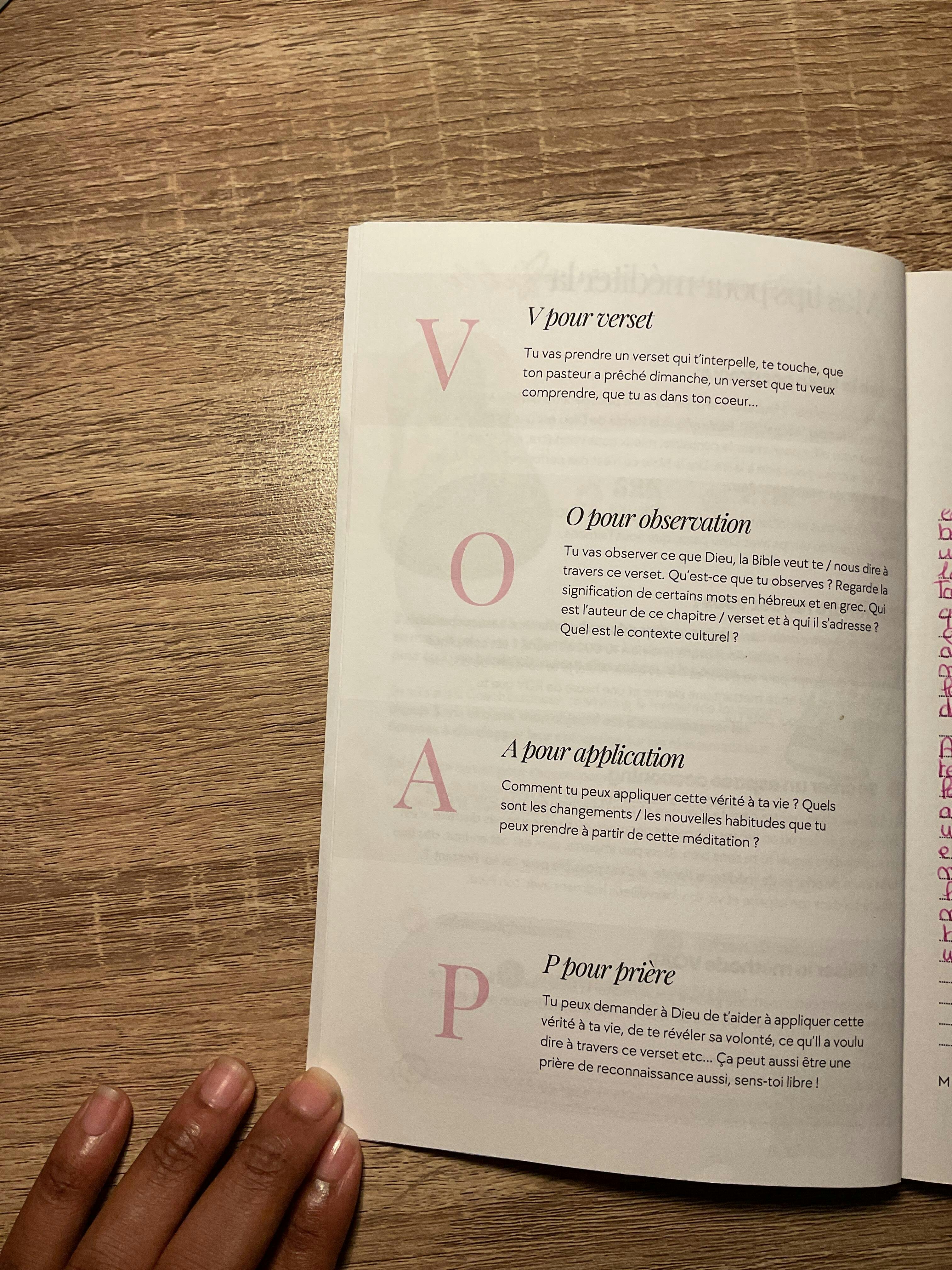 Le carnet qui t'aide à méditer la Bible simplement & à te rapprocher de Dieu avec la méthode VOAP, mes conseils concrets, tes fiches évolutions, tes sujets de prière, des citations et versets pour t'encourager quotidiennement...